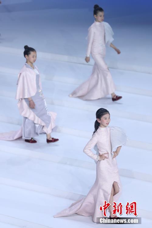 4月1日晚,VICKY’Z·許馨尹時(shí)裝發(fā)布會(huì)在北京舉行,本季服裝發(fā)布以極光(Aurora)為主題,一千多名小模特登臺(tái)表演。中新社記者盛佳鵬攝