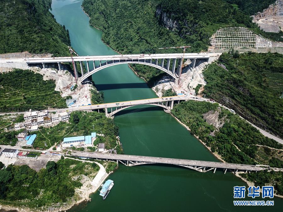 7月12日無(wú)人機(jī)拍攝的貴州織普高速公路控制性工程——夜郎湖特大橋(上)。新華社記者陶亮攝