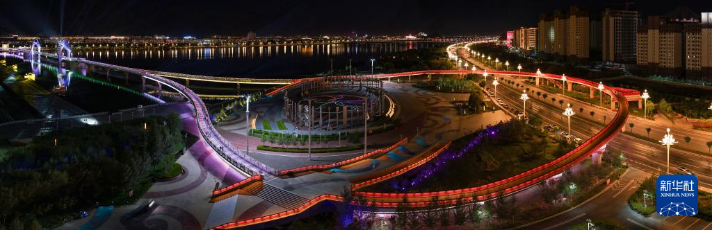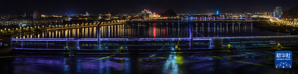 這是7月30日拍攝的拉薩河夜景,由近及遠分別是和美橋、柳梧大橋和連心橋(無人機拼接照片)。