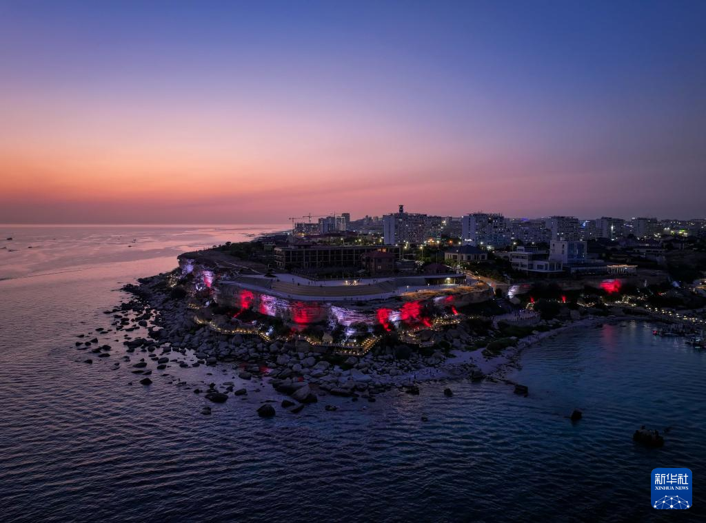 這是8月5日在哈薩克斯坦阿克套拍攝的日落時(shí)分的里海海濱風(fēng)光(無人機(jī)照片)。