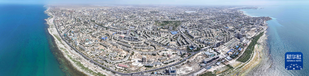這是8月5日在哈薩克斯坦阿克套拍攝的城市景觀(無人機(jī)全景合成照片)。