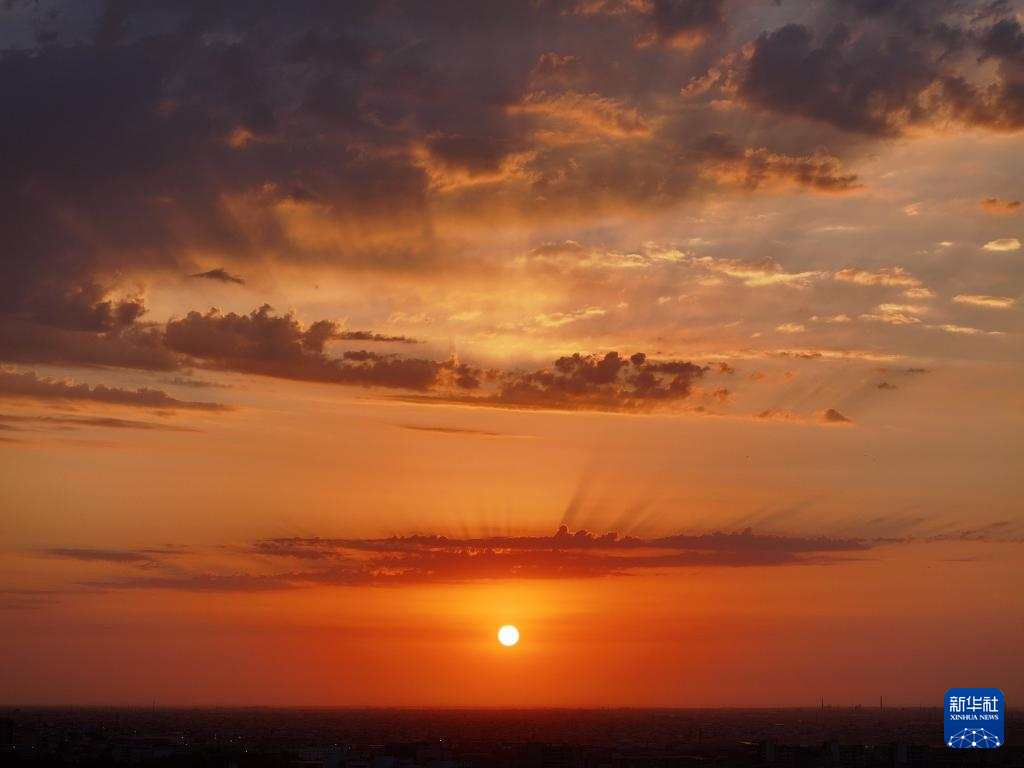 這是8月5日在哈薩克斯坦阿克套拍攝的日出景象(無人機(jī)照片)。