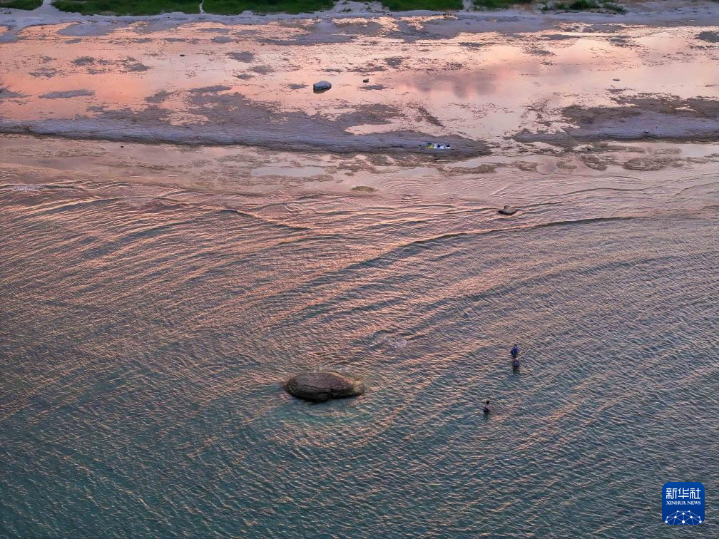 8月5日,人們于清晨時(shí)分在哈薩克斯坦阿克套海邊游玩(無人機(jī)照片)。