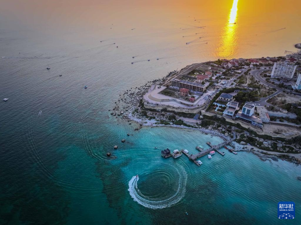 這是8月5日在哈薩克斯坦阿克套拍攝的傍晚時(shí)分的里海海濱風(fēng)光(無人機(jī)照片)。