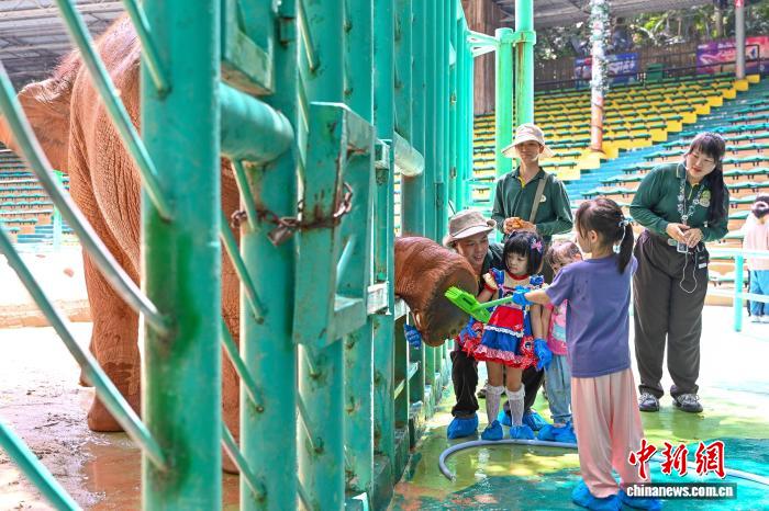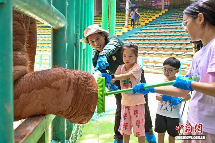 圖為小朋友在保育員的指導(dǎo)下為大象清潔象足。中新社記者陳驥旻攝