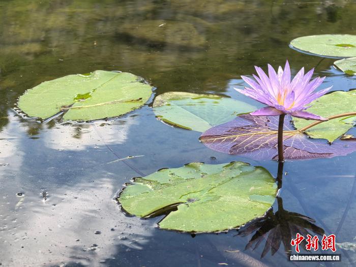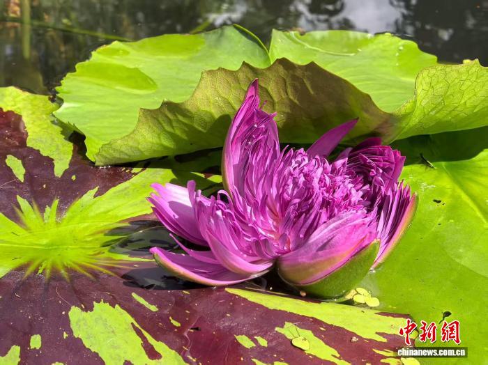 14日,上海辰山植物園內330余種睡蓮正在盛放。圖為睡蓮池中的“千絲染紫”睡蓮綻放。中新社記者陳靜攝