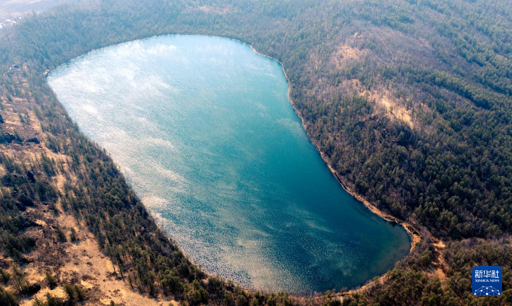 這是5月20日在內(nèi)蒙古阿爾山國家森林公園拍攝的駝峰嶺天池(無人機(jī)照片)。