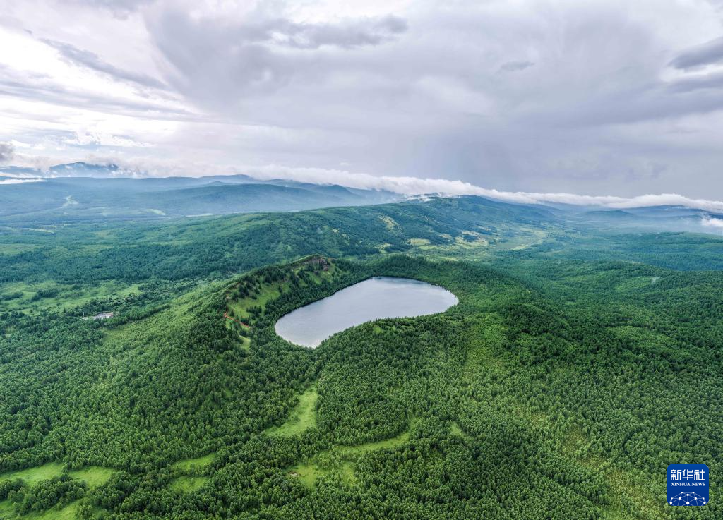 這是7月28日在內(nèi)蒙古阿爾山國家森林公園拍攝的駝峰嶺天池(無人機(jī)拼接照片)。