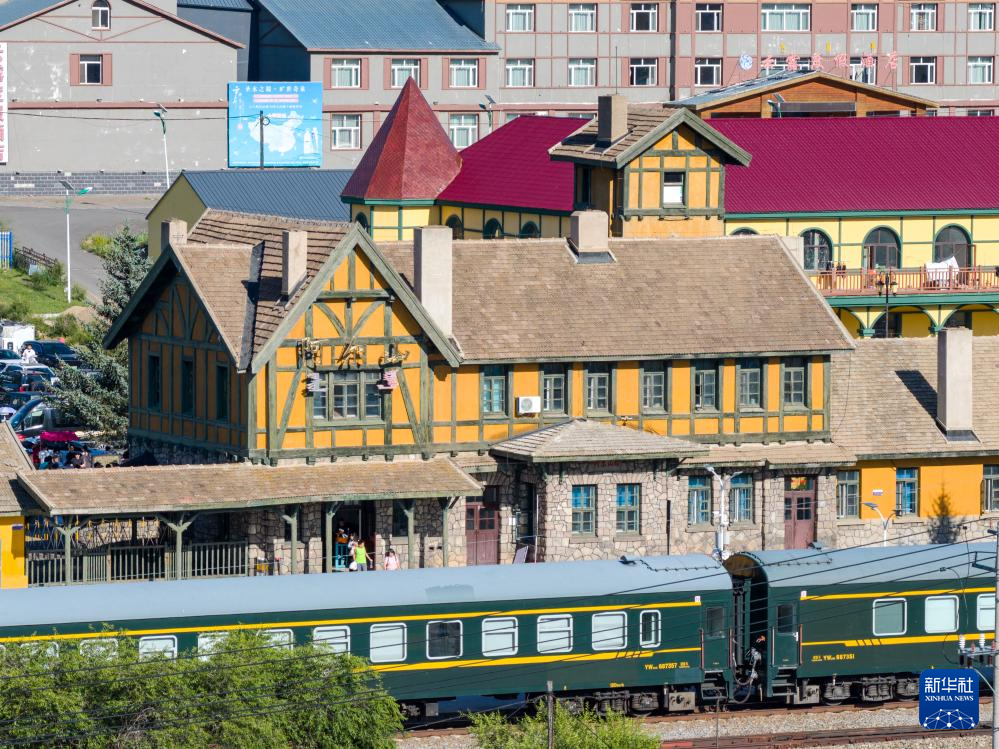 7月27日,一列火車駛出阿爾山火車站(無人機(jī)照片)。
