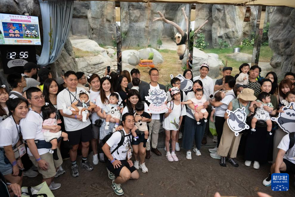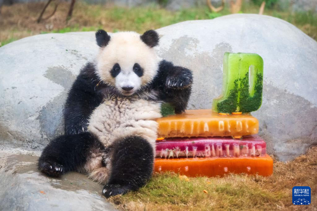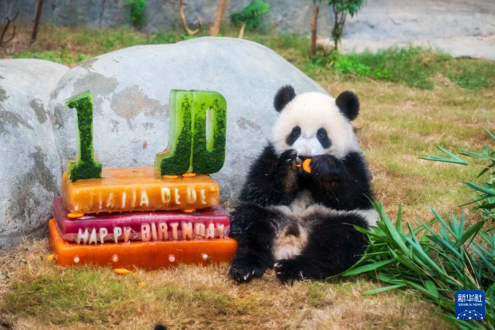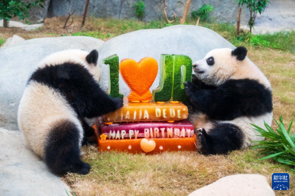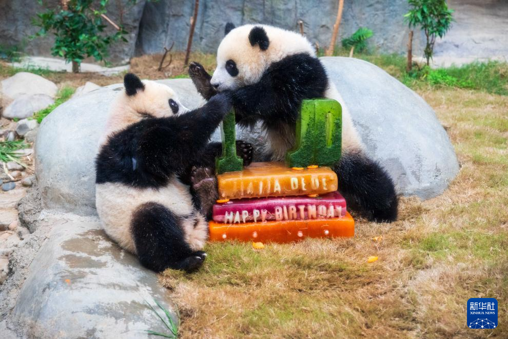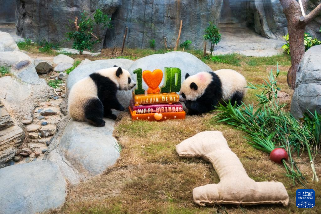 當(dāng)日,香港海洋公園為首對“港產(chǎn)”龍鳳胎大熊貓“加加”“得得”慶祝一歲生日。