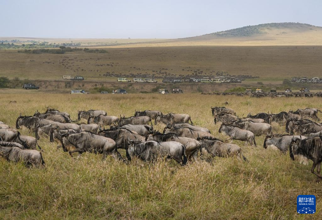 7月30日,在肯尼亞馬賽馬拉國(guó)家保護(hù)區(qū),渡過馬拉河的角馬在草原上活動(dòng)。