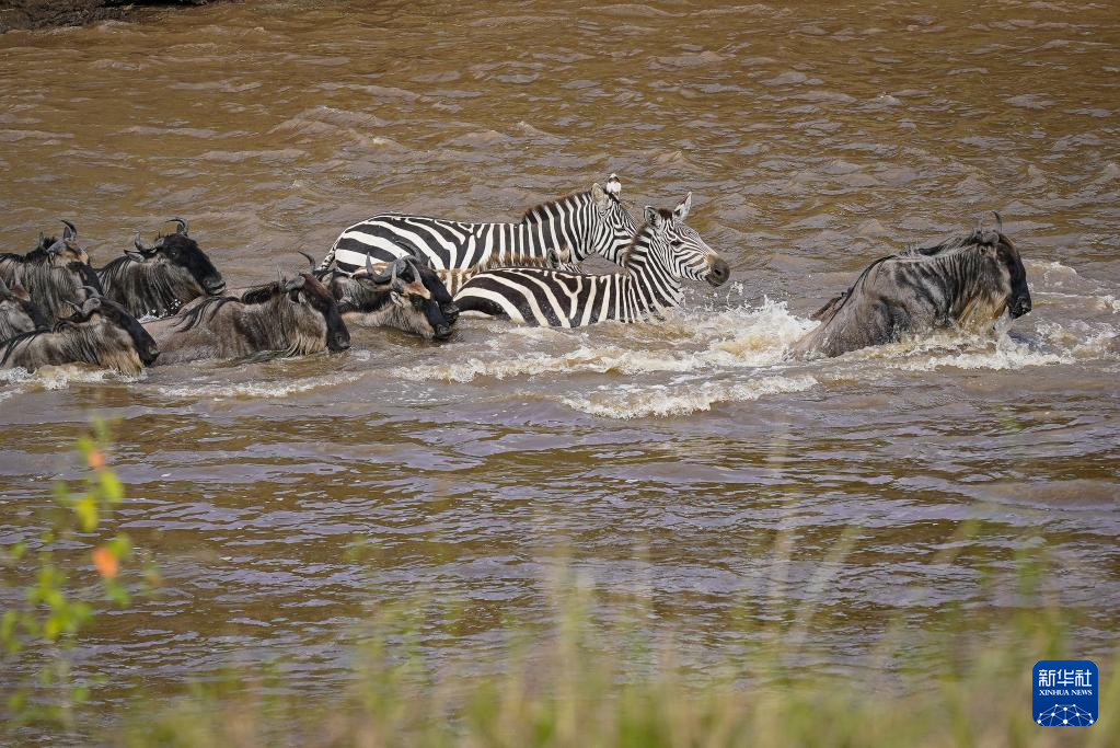 7月30日,在肯尼亞馬賽馬拉國(guó)家保護(hù)區(qū),角馬和斑馬渡過馬拉河。
