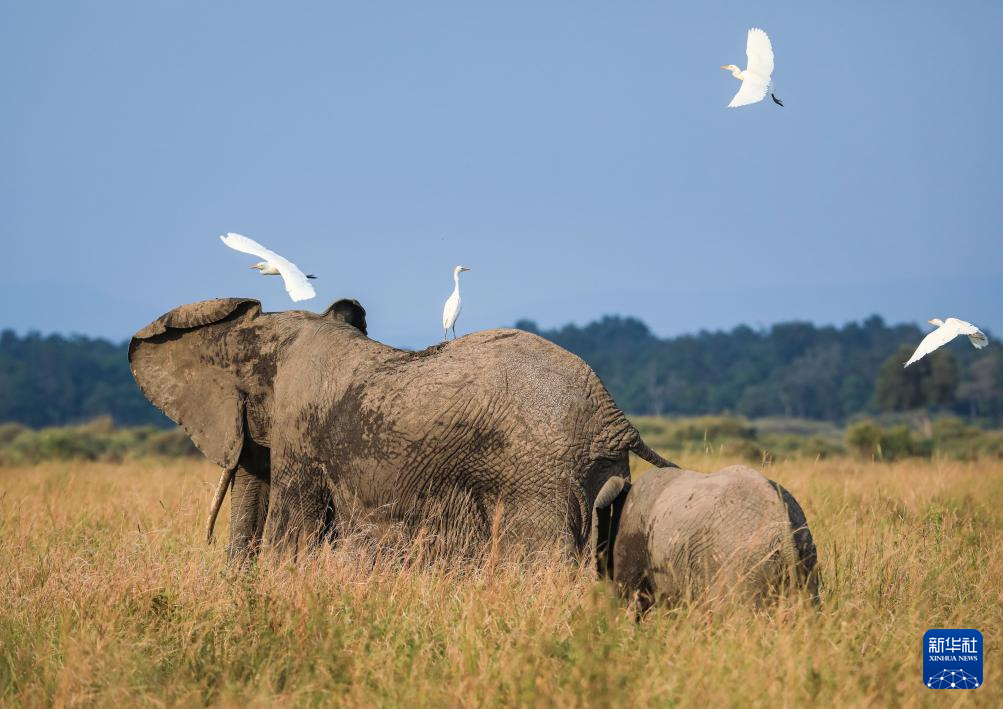 7月30日,在肯尼亞馬賽馬拉國家保護(hù)區(qū),大象和鳥類互動(dòng)。