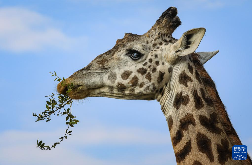 7月30日,在肯尼亞馬賽馬拉國家保護(hù)區(qū),一只長頸鹿在進(jìn)食。
