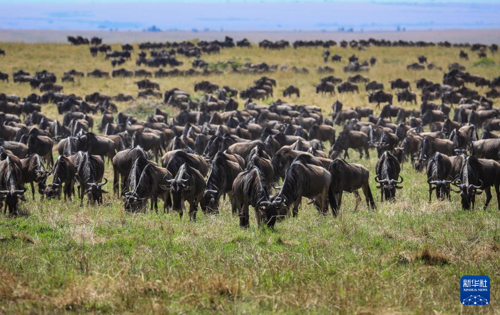 7月31日,在肯尼亞馬賽馬拉國家保護(hù)區(qū),成群的角馬在草原上覓食。