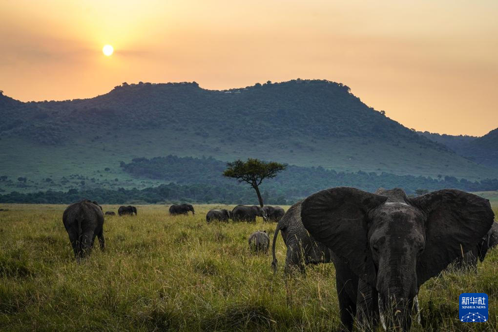 7月29日,在肯尼亞馬賽馬拉國家保護(hù)區(qū),大象在日落時(shí)分走過草原。