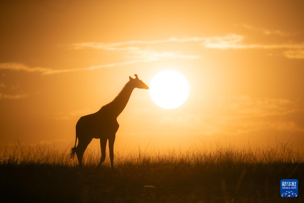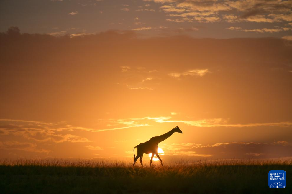 9月1日日出時分,在肯尼亞馬賽馬拉國家保護區(qū),一只長頸鹿在草原上行走。