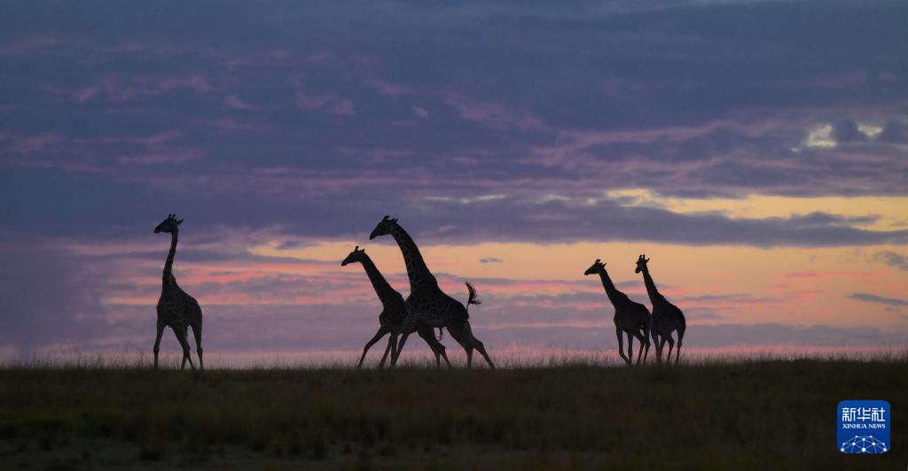 9月1日日出時分,在肯尼亞馬賽馬拉國家保護區(qū),一群長頸鹿在草原上奔跑。