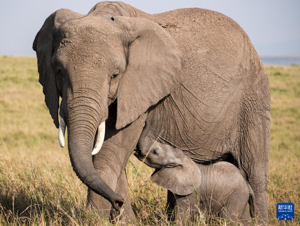 9月7日,在肯尼亞馬賽馬拉國家保護區(qū),一頭小象在母象腹下尋乳。