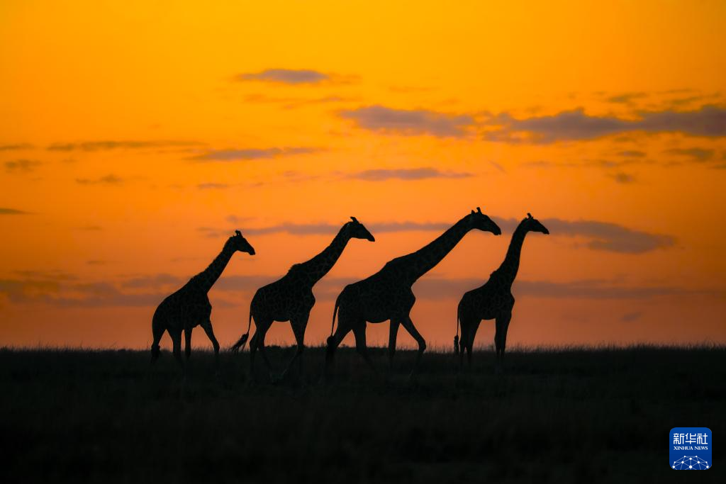 9月1日日出時分,在肯尼亞馬賽馬拉國家保護區(qū),一群長頸鹿在草原上行走。