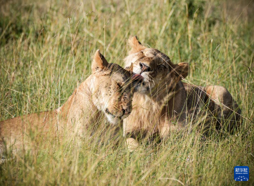 9月7日,在肯尼亞馬賽馬拉國家保護區(qū),一頭獅子為同伴舔毛。