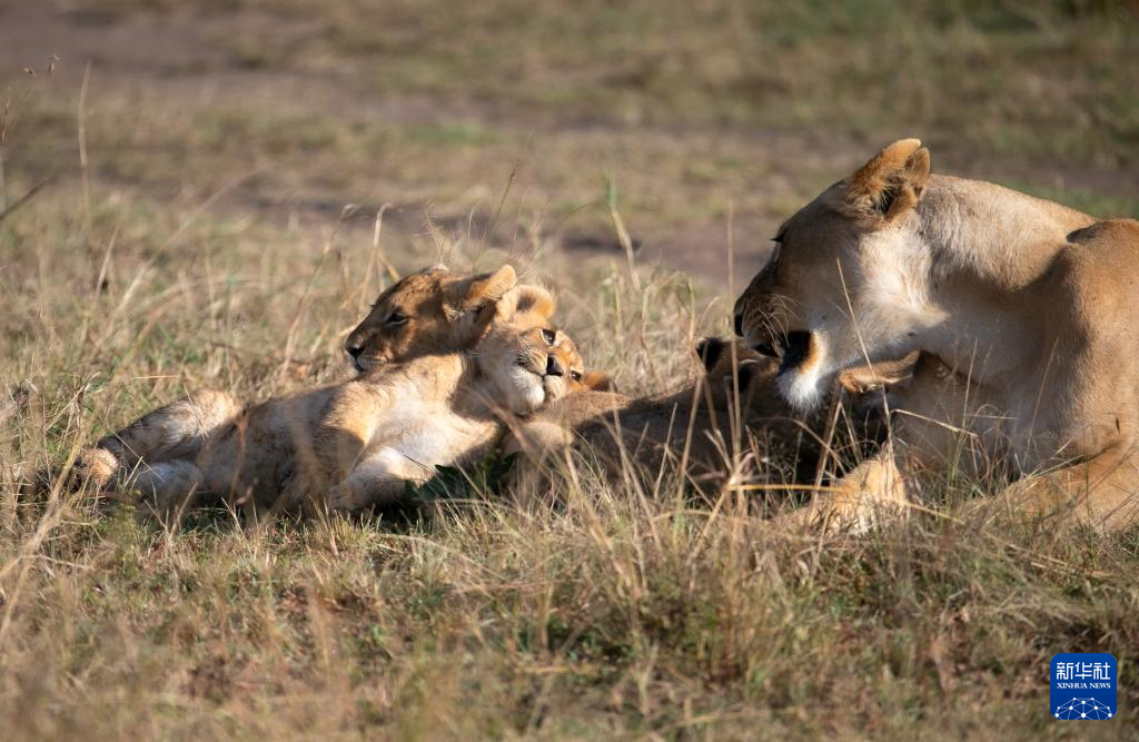 9月1日,在肯尼亞馬賽馬拉國家保護區(qū),一頭母獅(右)帶著小獅子在草原上休息。