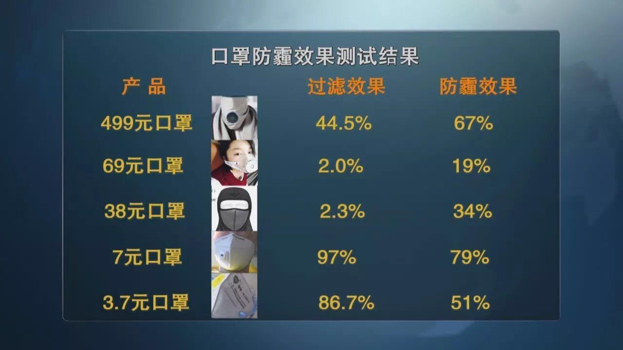 兩天后,測試人員得出了這樣的數(shù)據(jù),售價69元的明星同款口罩并不像它所宣程的那樣“有效過濾率大于91%”,而是只有2.0%;售價38元產(chǎn)品同樣數(shù)值偏低;499元的“高端產(chǎn)品”真實過濾效果是44.5%,防霾效果只有67%。而一款價格僅為7元錢的口罩,實際測試后效果還挺不錯,過濾效果97%,防霾效果達到79。