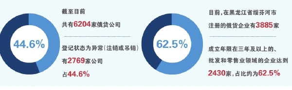 據(jù)天眼查,目前,在黑龍江省綏芬河市注冊(cè)的俄貨企業(yè)就有3885家,其中,成立年限在三年及以上的、批發(fā)和零售業(yè)領(lǐng)域的企業(yè)達(dá)到了2430家,占比約為62.5%。