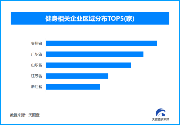 天眼查專業(yè)版數(shù)據(jù)顯示,截至目前我國(guó)現(xiàn)存在業(yè)、存續(xù)狀態(tài)的健身相關(guān)企業(yè)超163.6萬家。從區(qū)域分布來看,貴州省、廣東省、山東省、江蘇省健身相關(guān)企業(yè)數(shù)量位居前列,四個(gè)省市數(shù)量總和超過59萬余家,占企業(yè)總數(shù)的36.07%。