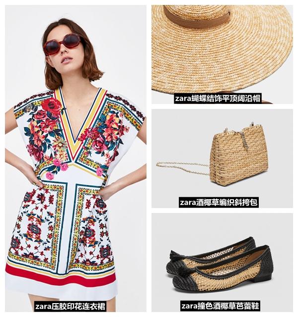 建議:建議搭配草編闊沿帽,以及同色系涼鞋和設(shè)計(jì)簡潔的包包,越簡潔越足以襯托出連衣裙印花的重點(diǎn),整體就會(huì)呈現(xiàn)出灑脫浪漫的度假感。
