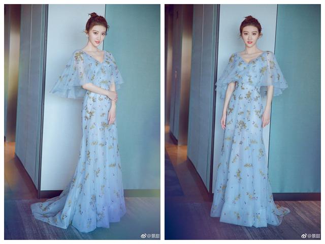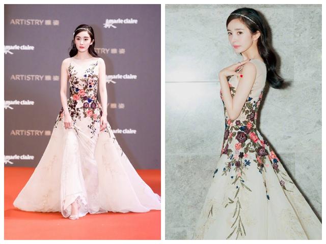 楊冪身穿中國風(fēng)刺繡花朵禮服裙