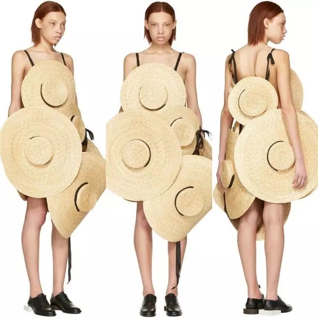 去年Jacquemus的創(chuàng)始人兼設(shè)計(jì)師的Simon Porte Jacquemus便推出了oversize超大號(hào)的硬質(zhì)平頂草帽,這款法國(guó)鄉(xiāng)村風(fēng)格的草帽上架立即銷(xiāo)售一空,隨即又在奢侈品零售電商Ssense推出一款全新夏裝——“Le Chapeau Santon”,全部由8頂草帽縫制而成,這條裙子沒(méi)有襯里,而且是100%的稻草,這可能會(huì)讓你有一種難以置信的穿衣體驗(yàn)。