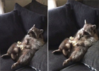 實拍小浣熊閑坐沙發(fā)愜意吃爆米花