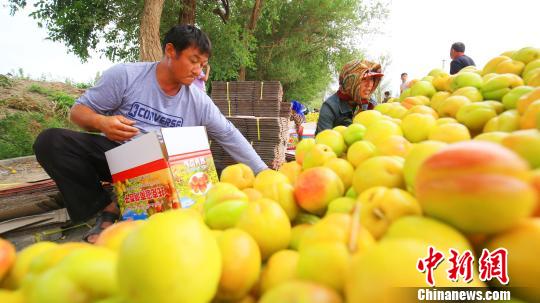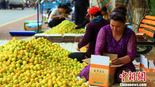 隨著物流行業(yè)的迅速發(fā)展,現(xiàn)在托克遜的杏子不僅在新疆銷售,更多的都運往了北京、上海、天津、甘肅、青海等地,在銷往中國內地之前,杏農(nóng)在裝箱打包?!〕逃褵様z