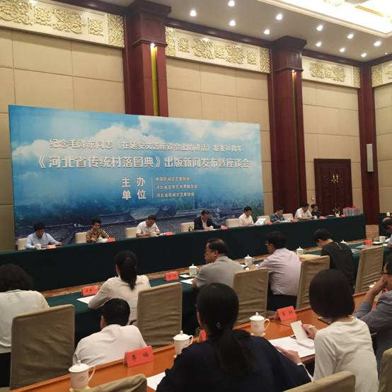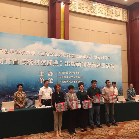 2018年5月23日上午,由中國(guó)民間文藝家協(xié)會(huì)、河北省文學(xué)藝術(shù)界聯(lián)合會(huì)、河北省民間文藝家協(xié)會(huì)聯(lián)合主辦的“紀(jì)念毛澤東同志《在延安文藝座談會(huì)上的講話(huà)》發(fā)表76周年——《河北省傳統(tǒng)村落圖典》出版新聞發(fā)布及座談會(huì)”在石家莊市太行國(guó)賓館隆重舉行。中國(guó)文聯(lián)副主席、河北省政協(xié)副主席邊發(fā)吉,中國(guó)民協(xié)分黨組成員、副秘書(shū)長(zhǎng)周燕屏,中國(guó)文聯(lián)民間文藝藝術(shù)中心主任徐岫娟,中共河北省委宣傳部副部長(zhǎng)史建偉,河北省文聯(lián)黨組書(shū)記、副主席解曉勇,河北省文聯(lián)黨組成員、副主席路皓,河北省文聯(lián)黨組成員、副主席祁海峰,中國(guó)民協(xié)顧問(wèn)、河北省民協(xié)主席鄭一民、河北教育出版社副總編輯郝建國(guó)等領(lǐng)導(dǎo)和專(zhuān)家學(xué)者出席,以此活動(dòng)來(lái)紀(jì)念毛澤東同志發(fā)表《在延安文藝座談會(huì)上的講話(huà)》76周年。