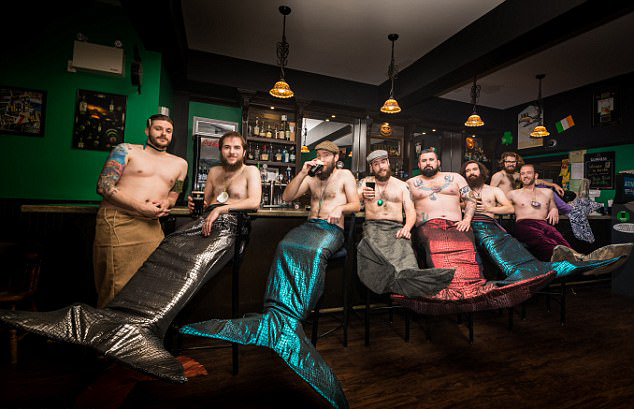 照片中最滑稽的,是一些男性竟然呈現(xiàn)出了一種很放松的狀態(tài),在巖石海岸上拍打著他們的尾巴,有的還在酒吧喝酒。他們也出現(xiàn)在其他地方,做著正常男人會做的平常事,比如在理發(fā)店里剪頭發(fā),或者彈吉他,但這一切都是在穿著人魚服的情況下進(jìn)行的。