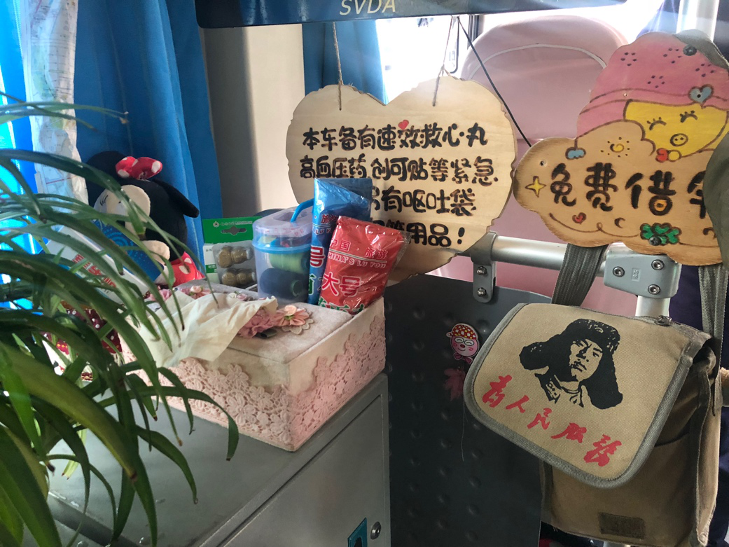 為了讓乘客有個良好的乘車環(huán)境,在新能源車上線后,駕駛員張繼菊就自掏腰包,讓車廂內(nèi)爬滿了綠植。不僅如此,車內(nèi)暈車藥、創(chuàng)可貼、雨傘等應(yīng)急物品也應(yīng)有盡有,“考慮到?jīng)]有固定還傘點,下雨天我會準(zhǔn)備一些一次性雨衣?!睆埨^菊說道。