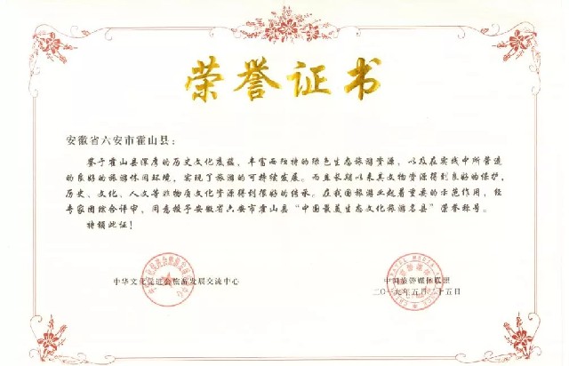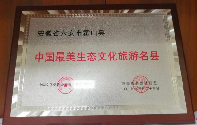 5月25日,在上海舉行的2019年中國新型旅游產(chǎn)業(yè)發(fā)展大會上,由霍山縣文化旅游發(fā)展中心申報,經(jīng)過專家評議、媒體推廣等多環(huán)節(jié)綜合評選,霍山縣因具有濃厚的歷史文化底蘊(yùn),豐富而獨(dú)特的綠色生態(tài)旅游資源,良好的旅游發(fā)展環(huán)境,文化旅游得到融合發(fā)展而被授予“中國最美生態(tài)文化旅游名縣”榮譽(yù)稱號。