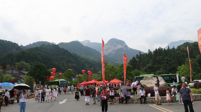 仲夏時節(jié)正是金寨最美的季節(jié),藍天白云,青山含翠,碧波蕩漾。記者一行來到這漫山披綠、鳥語花香的大別山腹地人間仙境天堂寨。7月8日是農(nóng)歷六月初六,當(dāng)天第九屆天貺民俗文化旅游節(jié)在風(fēng)景秀麗的國家5A景區(qū)安徽天堂寨拉開了帷幕。國際徽商交流協(xié)會高資委、合肥市原政協(xié)主席周富如,天堂寨榮譽寨民曹承芳、史紅雨、周森,六安市文化和旅游局黨組副書記、副局長漆學(xué)敏及縣領(lǐng)導(dǎo)張澗、周其國、蔡黎麗、易成林出席活動。??