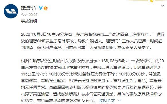 事故說明稱,2020年8月6日16點(diǎn)09分左右,在廣東省肇慶市二廣高速四會(huì)、連州方向,一輛行駛的理想ONE發(fā)生了意外事故,導(dǎo)致車輛起火。目前兩名車上人員留院觀察,其余乘員人身安全。