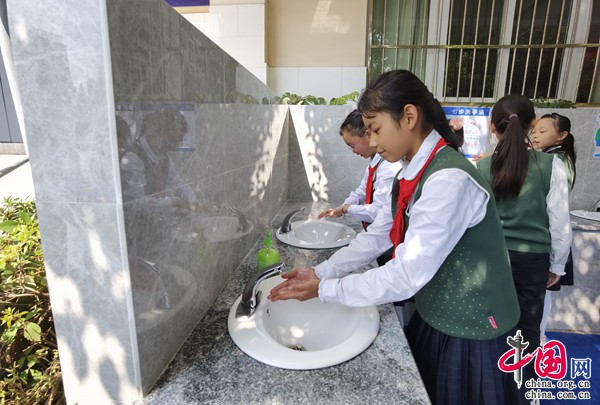 預(yù)防疾病,從正確洗手開始。在西山區(qū)春苑小學(xué)東校區(qū),學(xué)校大門右手邊就有剛建好的洗手臺(tái)。統(tǒng)一白色陶瓷的洗手盆旁邊擺放著洗手液,洗手臺(tái)前,六年級(jí)的孫一欽剛上完籃球課,他洗干凈手就可以吃午飯了。孫一欽很自豪地說:“以前洗手只能去廁所洗,又沒有洗手液,很多時(shí)候直接就不洗了?,F(xiàn)在學(xué)?,F(xiàn)在到處都有洗手臺(tái),讓我們想洗手隨時(shí)都可以。而且很多洗手臺(tái)都張貼有正確洗手步驟,今后我們將更注重個(gè)人衛(wèi)生了,學(xué)校越來越美了,自己更愛自己的學(xué)校了?!?/p>