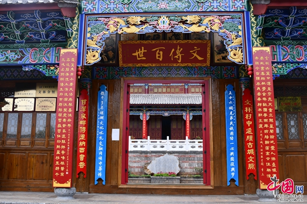 “這門始建于1764年,當年由藏傳佛教四寶法王賜題,寓意吉祥甘露喜降城東文林?!币蛔叽鬂嵃椎氖婚T佇立于文林村村口,鐫刻的“花雨東林”四個字在陽光下熠熠生輝,村民楊爾剛說,“文林被稱為‘云南最美鄉(xiāng)村’,不單單是因為房子美,更重要的是這里的民族文化和民族團結(jié)共同打造的美。”