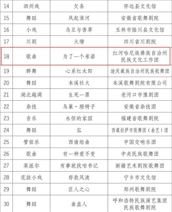 近日,文化和旅游部公布了“慶祝中國共產(chǎn)黨成立100周年舞臺藝術精品創(chuàng)作工程”重點扶持作品名單。其中,紅河州民族文化工作團創(chuàng)作的歌曲《為了一個承諾》入選100個“百年百項”小型作品創(chuàng)作計劃重點扶持作品名單。