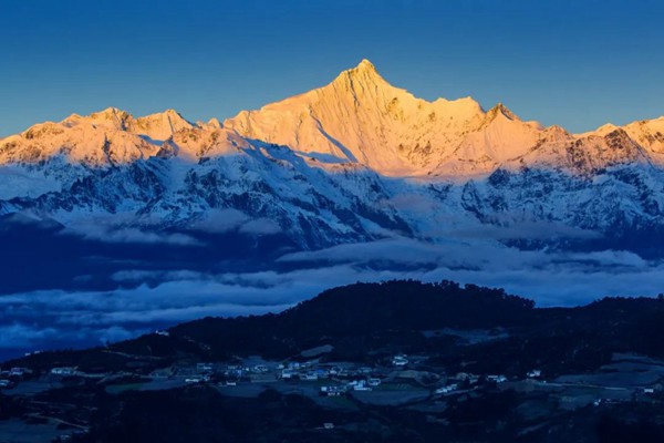 7點30分,一縷曙光突然出現,海拔最高的山峰被率先點亮,隨后太陽光越過阻礙突然照射在雪山頂上,形成一個金色的光暈,看過梅里日照金山的人是幸運的。
