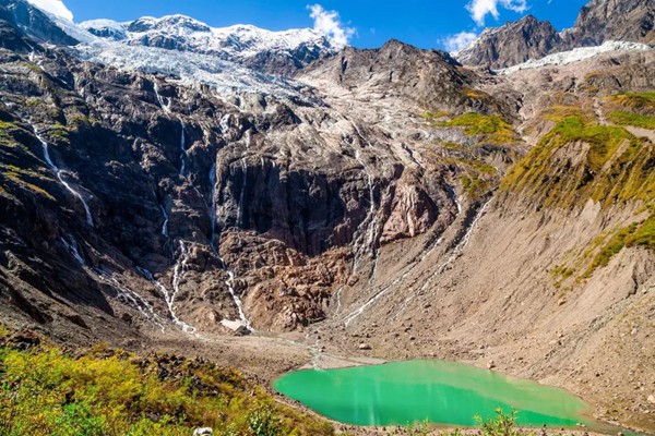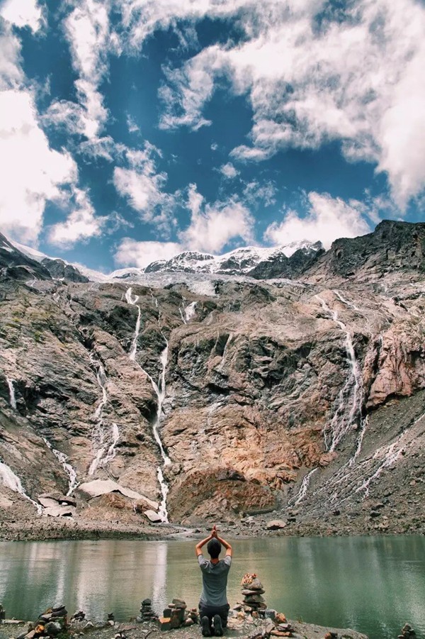 攀上最后的陡坡,站在一塊巨大的巖石上時,終于能看見那深藏閨中的冰湖了。繞過湖邊的瑪尼堆可以走到冰川的底部,觸摸一下正在消融的千年冰雪。