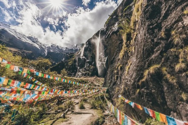 雨崩神瀑景色隨季節(jié)變化而變化,春夏冰雪消融,瀑布水流增大,落入地面,濺沫飛揚,秋冬時節(jié),水流變小,山風過處時凌空擲地,有如憑空由雪山上垂下的哈達般千絲萬縷的水線。