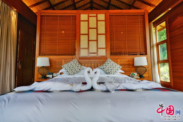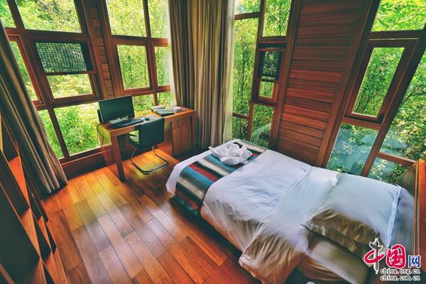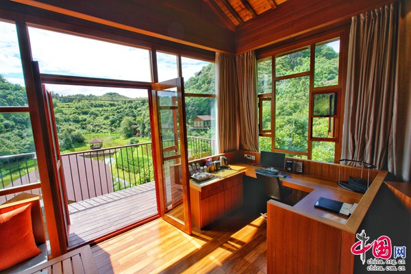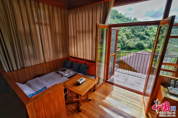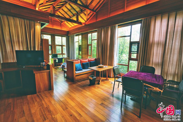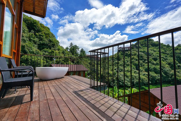 全木質(zhì)結(jié)構(gòu)的別墅,三面環(huán)窗,窗外草木蔥蘢,歲月靜好,讓人靜享歸隱山林之樂。房間內(nèi)還設(shè)有大泡池,可以欣賞景區(qū)全景。寬闊陽臺搭配戶外織布床墊、桌椅、餐椅,可隨時隨地欣賞山水風(fēng)光。
