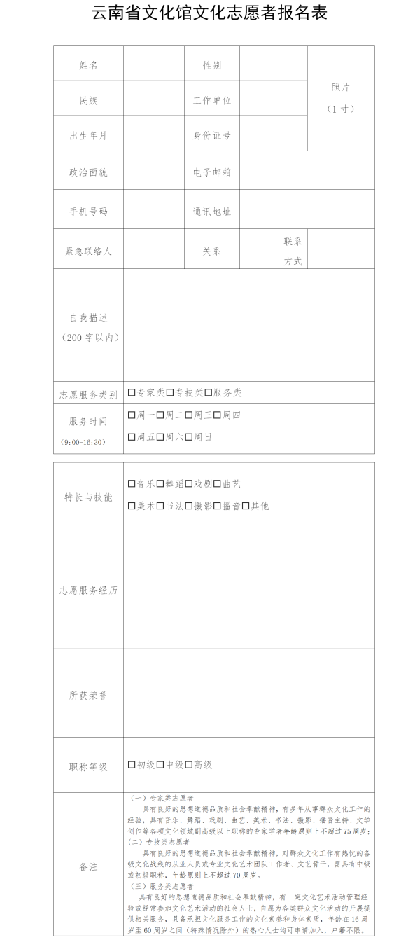 報(bào)名者在微信公眾號(hào)上搜索“云南公共文化云”平臺(tái),在分欄中選擇進(jìn)入“文化云”,選擇“志愿者”版塊,按照“志愿者注冊(cè)”欄要求填報(bào)?;虺直救松矸葑C及身份證復(fù)印件一張、一寸個(gè)人照片兩張(如果選擇專家或?qū)<贾驹刚撸璩致毞Q或相關(guān)證書原件及復(fù)印件一張),每周一、周三14:30至17:00到云南省文化館德馨樓105(社會(huì)活動(dòng)中心)進(jìn)行現(xiàn)場(chǎng)報(bào)名。