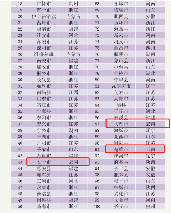 研究結(jié)果顯示,2020年全國綜合競爭力百強縣(市)分布在17?。ㄊ校渲性颇习矊幨?、大理市、楚雄市3地入選,分別位列全國排名第43位、87位及91位。同時,安寧市還上榜2020年全國投資潛力百強縣(市),投資潛力位列全國第一。