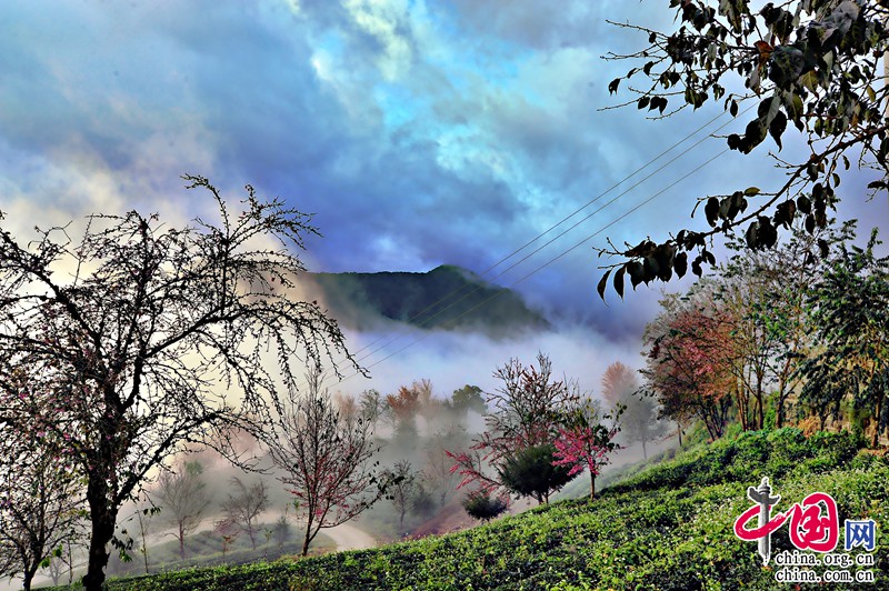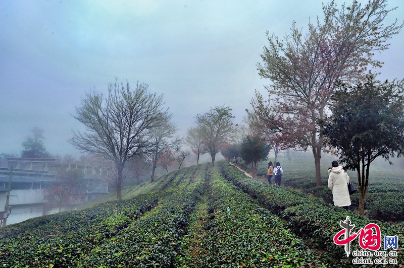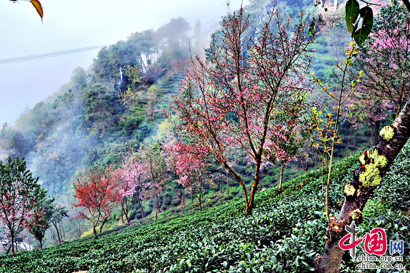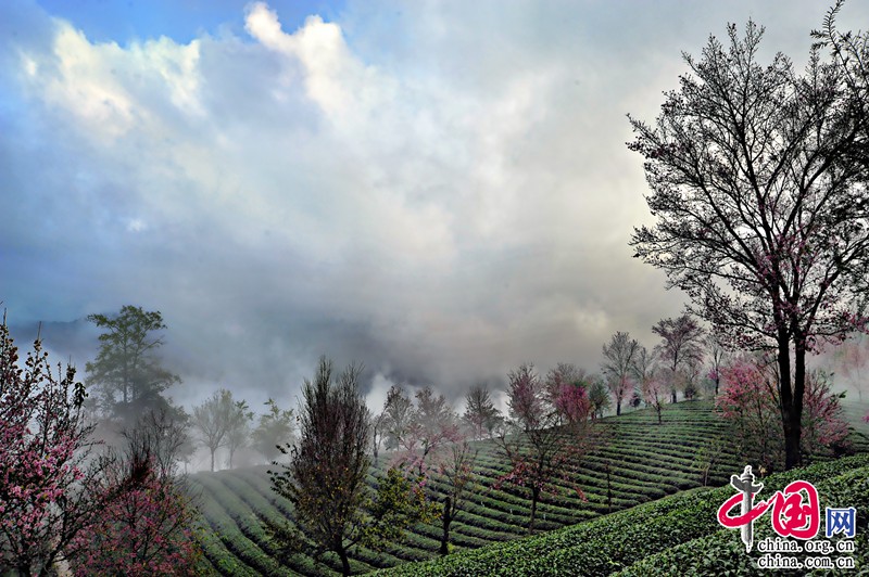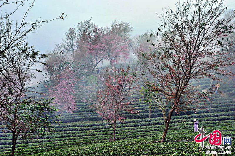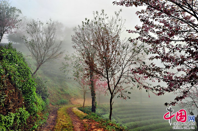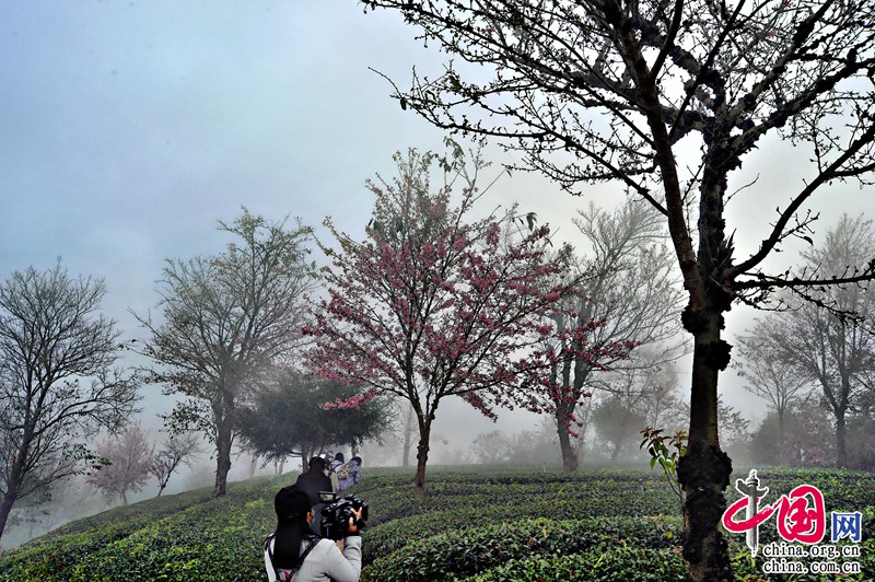 無量山櫻花谷所在地的華慶茶廠的工作人員介紹,整個茶園一共有1500畝。2000年,開始種植茶葉,主要種植烏龍茶和鐵觀音,同期也種下冬櫻花,作為蔭蔽樹為茶園遮擋紫外線。20年間,整個茶園的櫻花已達(dá)16000達(dá)株。每年的11月中下旬開始開放,花期為兩個月,每年有近30萬人次前來觀賞櫻花。